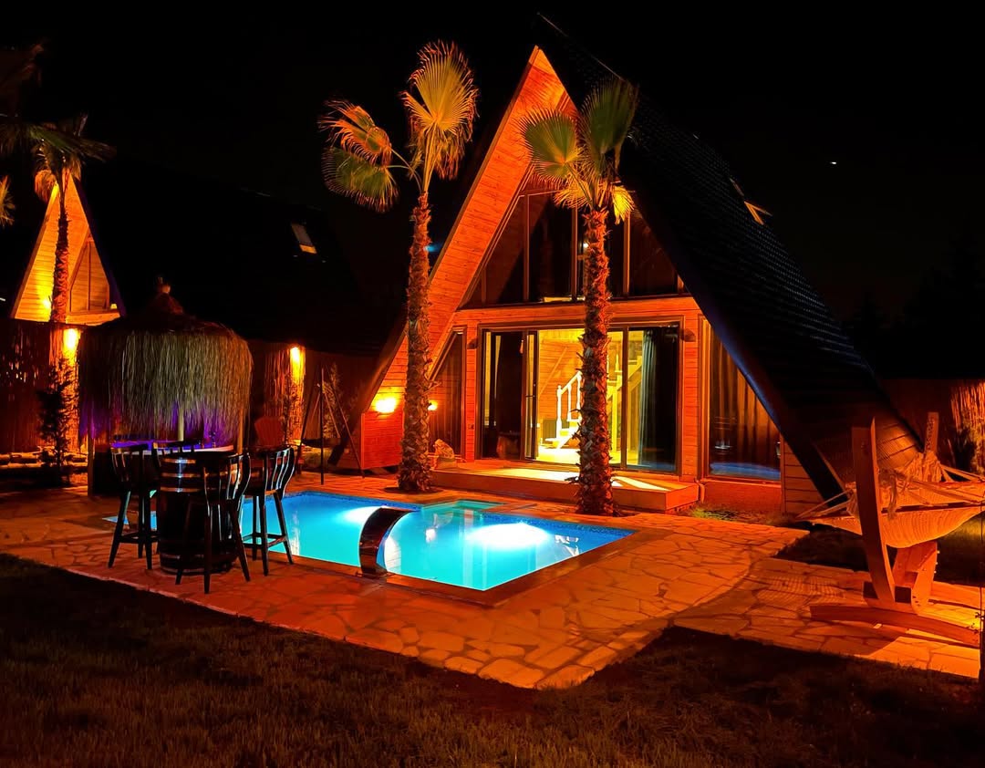 8 kişilik özel kullanım alanı, sıcak havuz, iç & dış jakuzi, müstakil bahçe, ateş çukuru ve barbekü
